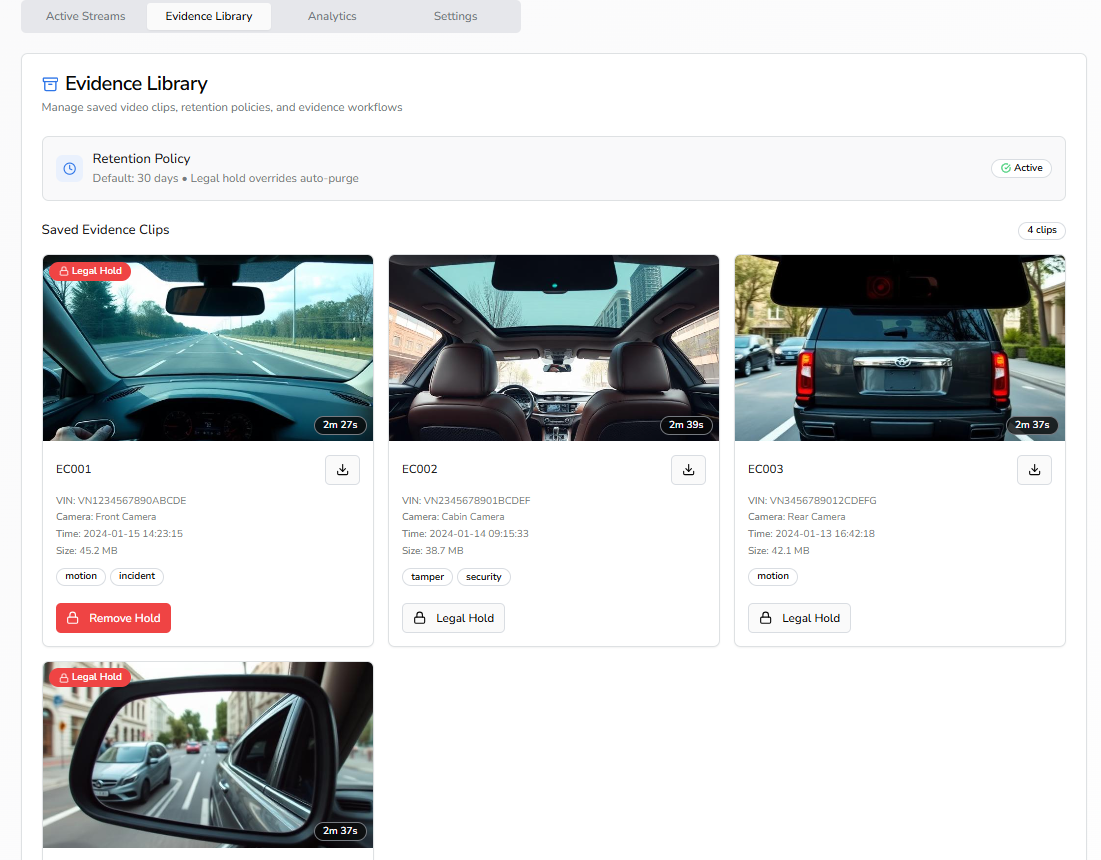 Connected video streaming powered by DCP can bring together multi-camera live streaming, VIN-linked access and consent tracking, geo-fencing restrictions, face and license plate masking, and an evidence library - all managed through the same platform operators already use for vehicle lifecycle management.