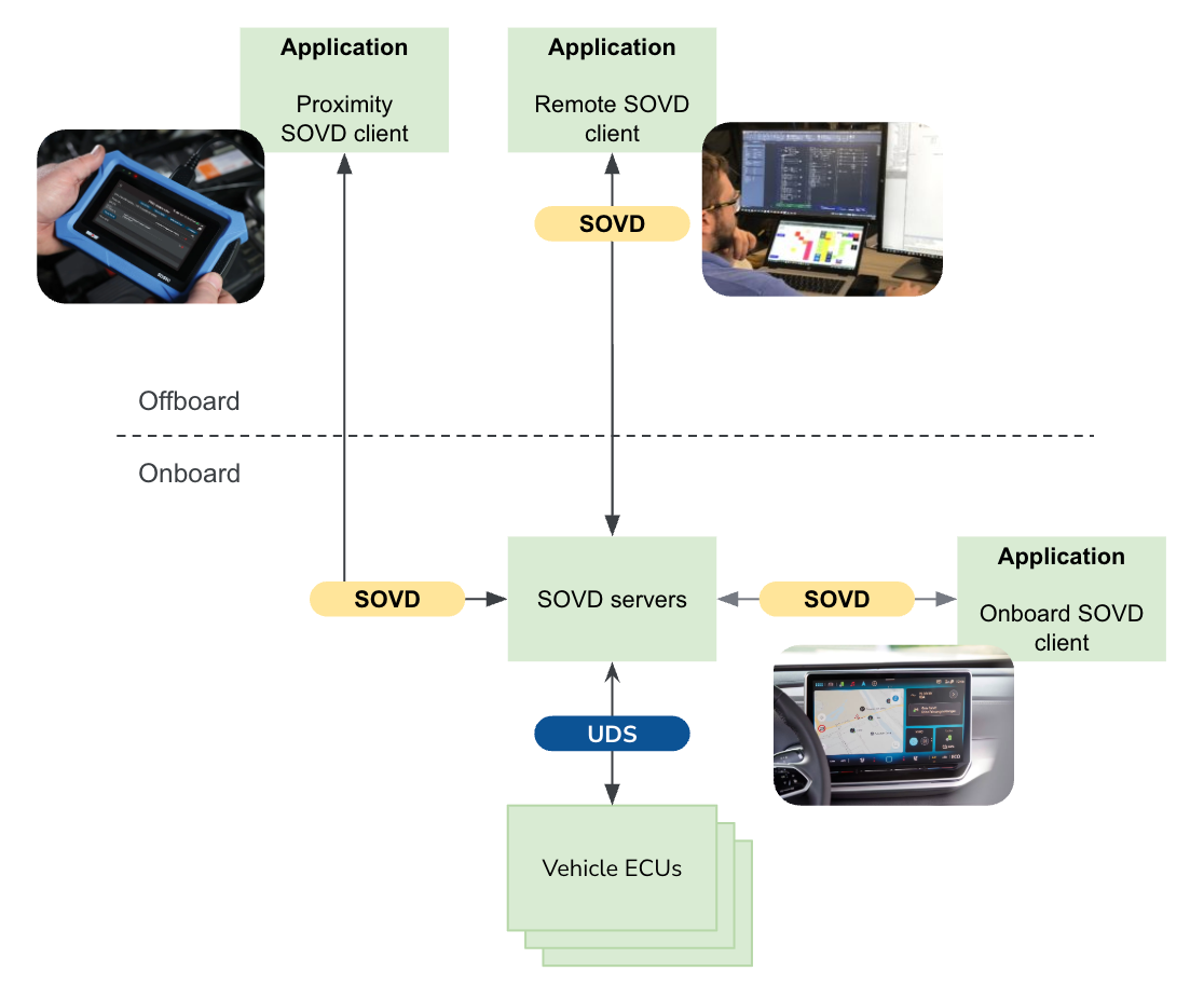 SOVD defines a unified API that works across remote (cloud-based), proximity (in-shop), and in-vehicle scenarios. An independent repairer connecting at the workshop, a fleet operator monitoring remotely, and an OEM support engineer doing pre-triage before a service visit all interact through the same logical interface - with access governed by role-based permissions, not by which proprietary tool stack they happen to have.