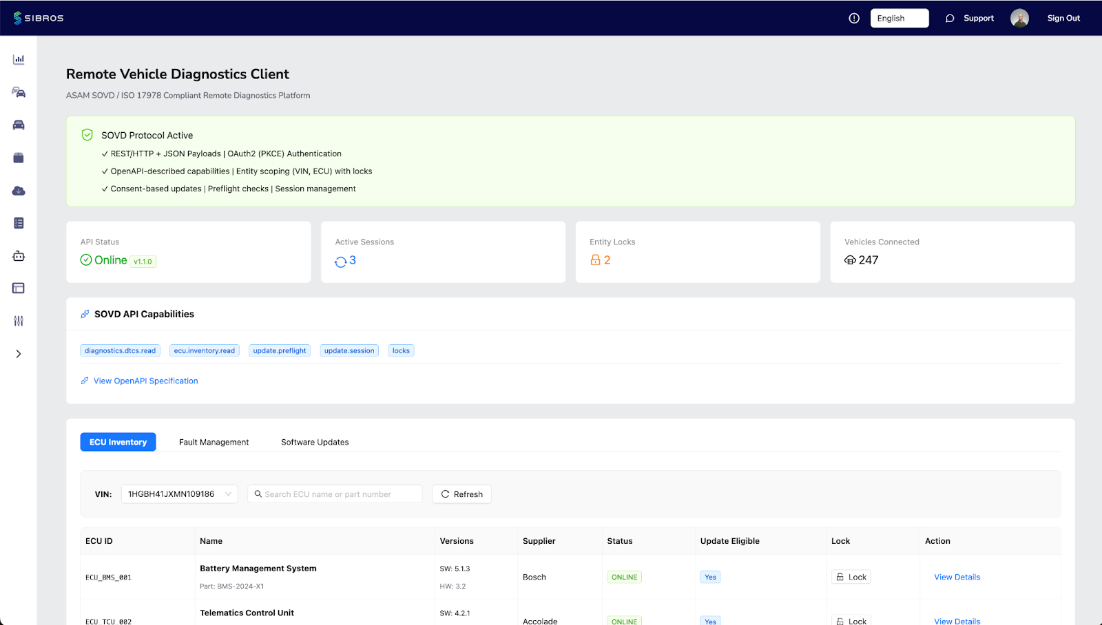 Sibros has built a full SOVD offering - covering both in-vehicle server capabilities and cloud/back-office tooling - designed for OEMs moving from architectural evaluation to production deployment. Our offering includes:
