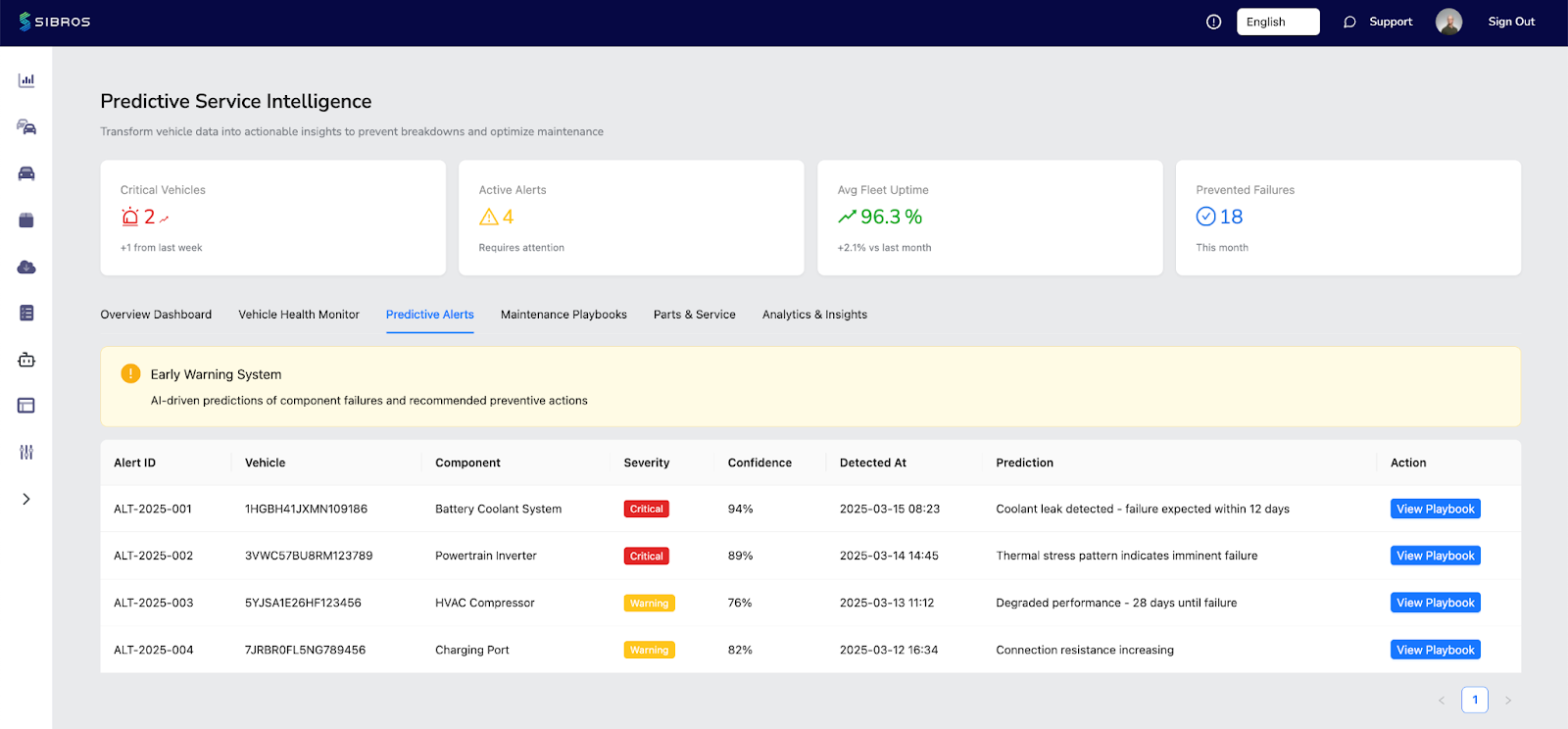 The Predictive Service Intelligence app on the Sibros Marketplace can arm fleet service operators with intelligent risk scoring, fault heatmaps, early warnings, repair playbooks, parts recommendations, and uptime forecasting as a connected-vehicle solution - without the months of custom development. Learn more at marketplace.sibros.tech.
